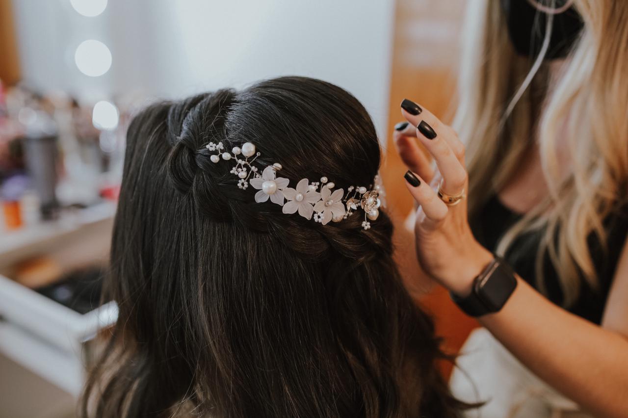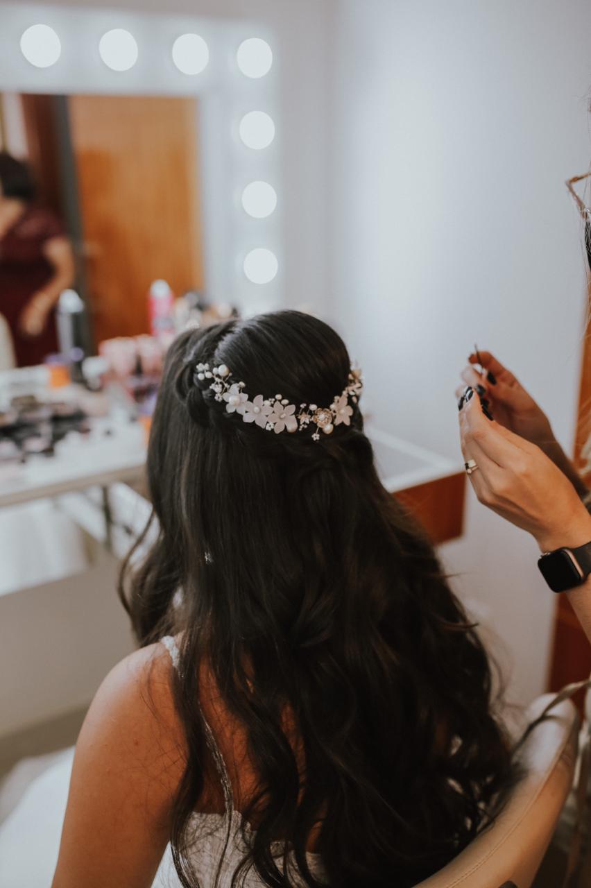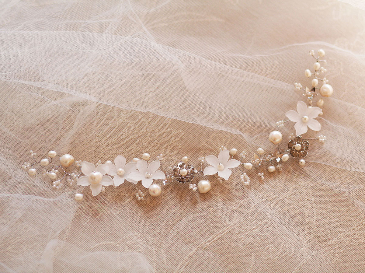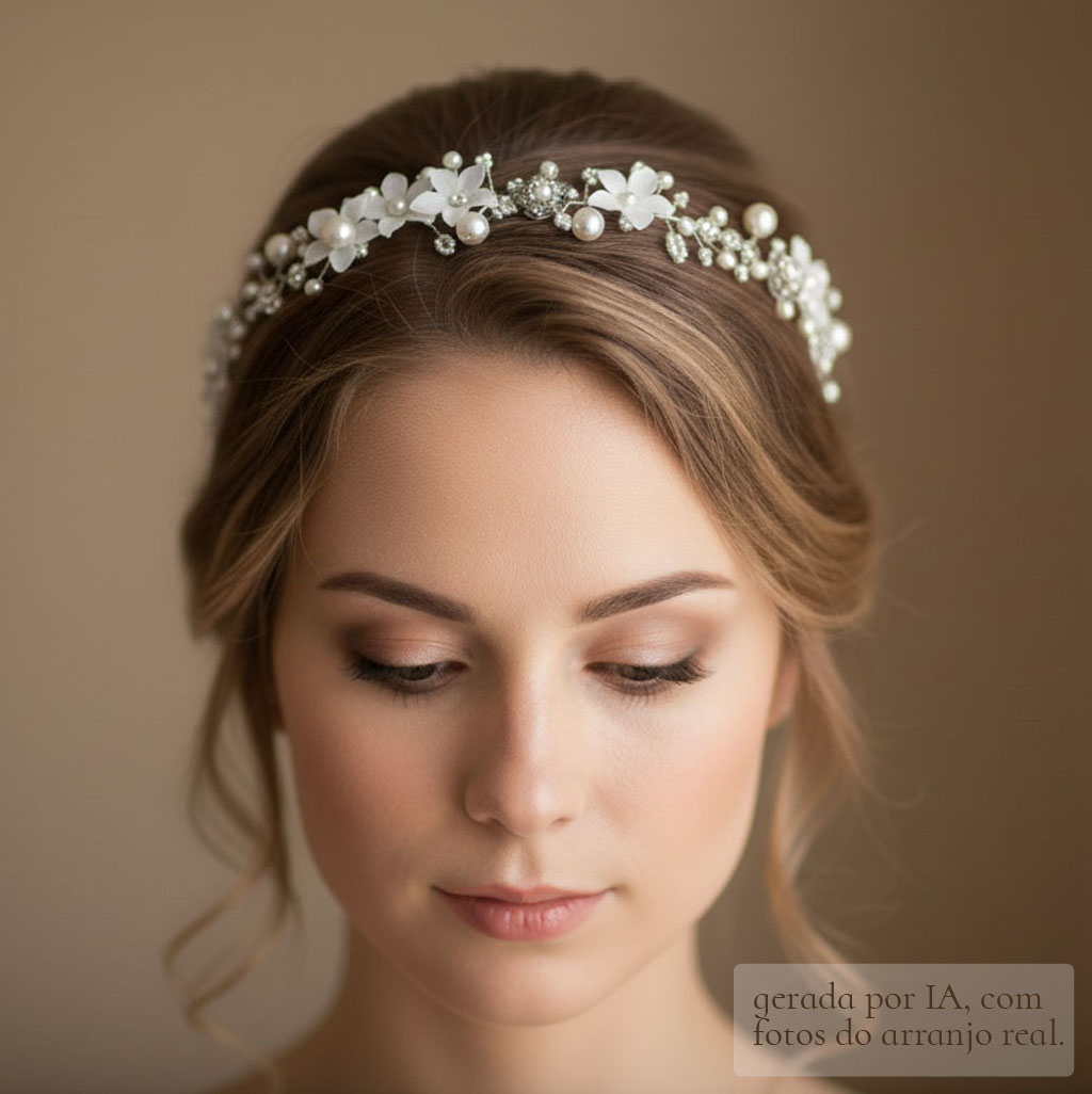 Uma meia coroa de 28 cm de comprimento, toda feita com pérolas naturais barrocas nas cores off white e creme, 5 flores de resina foscas com adição de 7 delicadas flores de metal maciço e missangas creme da marca tcheca Preciosa®. Uma peça especialmente trançada à mão, tendo como base um fio de metal banhado a ouro branco. Fixada no penteado através de grampos de cabelo comuns em qualquer “espacinho” entre as pérolas e missangas.
