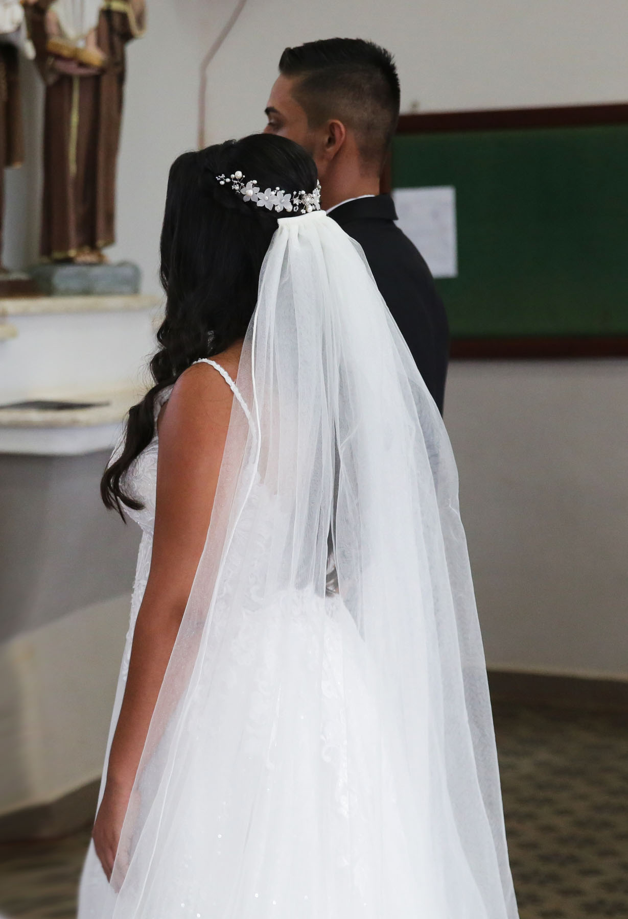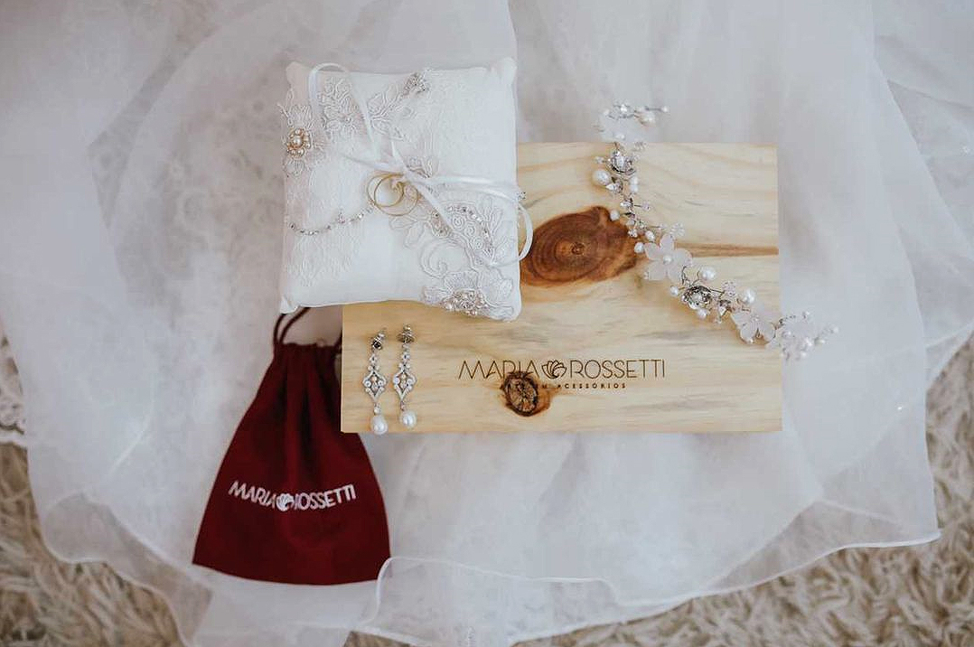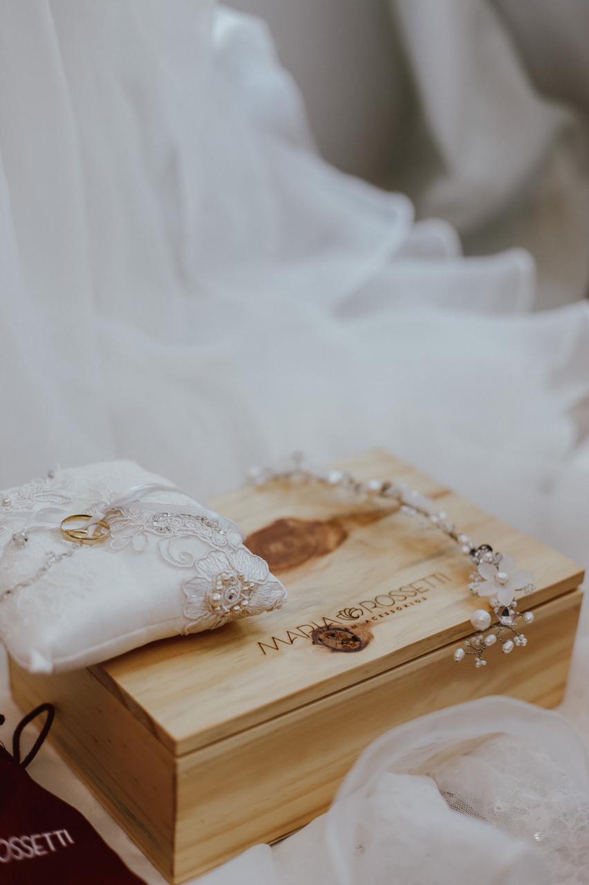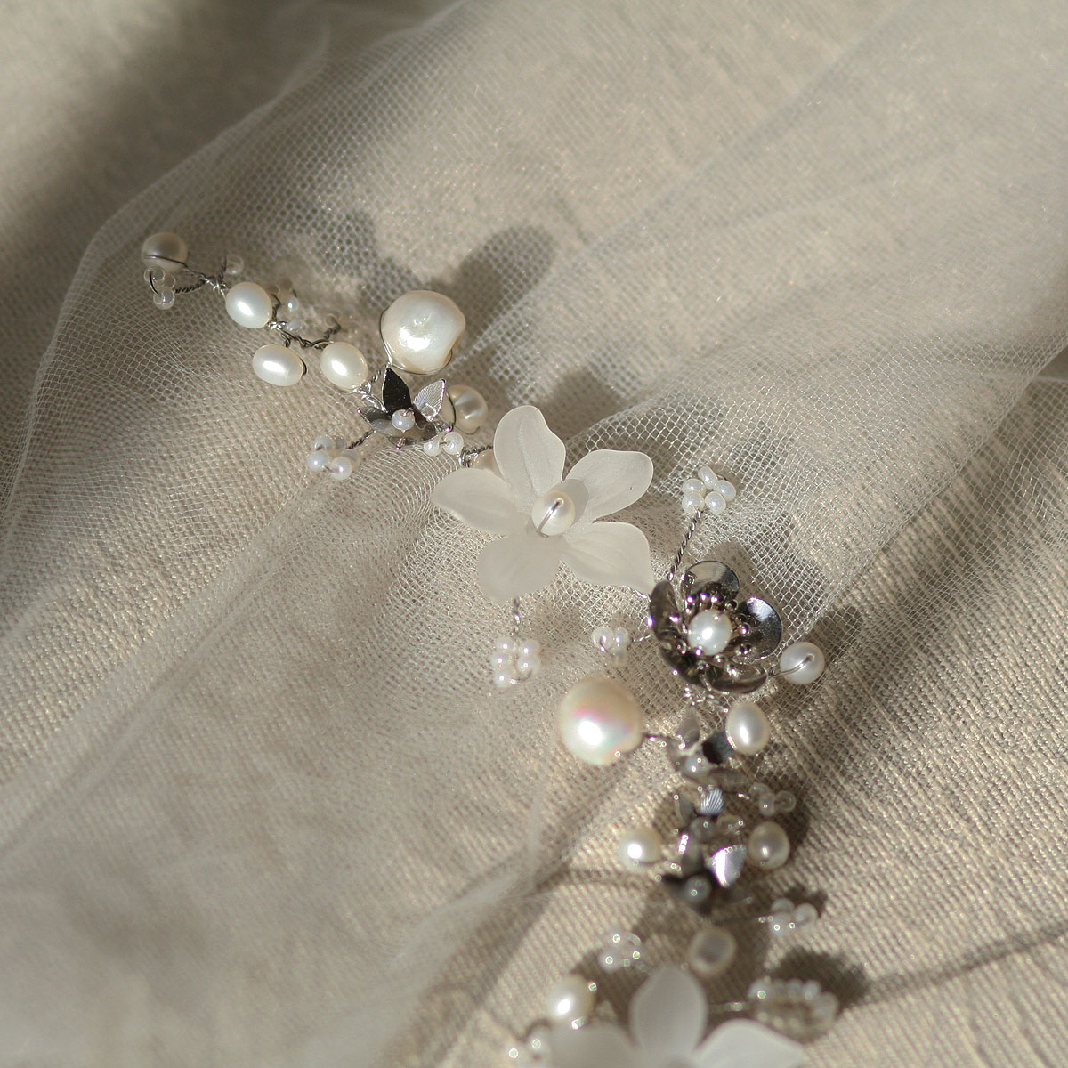 Uma meia coroa de 28 cm de comprimento, toda feita com pérolas naturais barrocas nas cores off white e creme, 5 flores de resina foscas com adição de 7 delicadas flores de metal maciço e missangas creme da marca tcheca Preciosa®. Uma peça especialmente trançada à mão, tendo como base um fio de metal banhado a ouro branco. Fixada no penteado através de grampos de cabelo comuns em qualquer “espacinho” entre as pérolas e missangas.