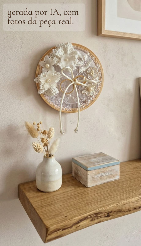 Há também a possibilidade de usar os porta-alianças como peças decorativas na parede da sua casa nova! (Veja a montagem-inspiração feita com IA)